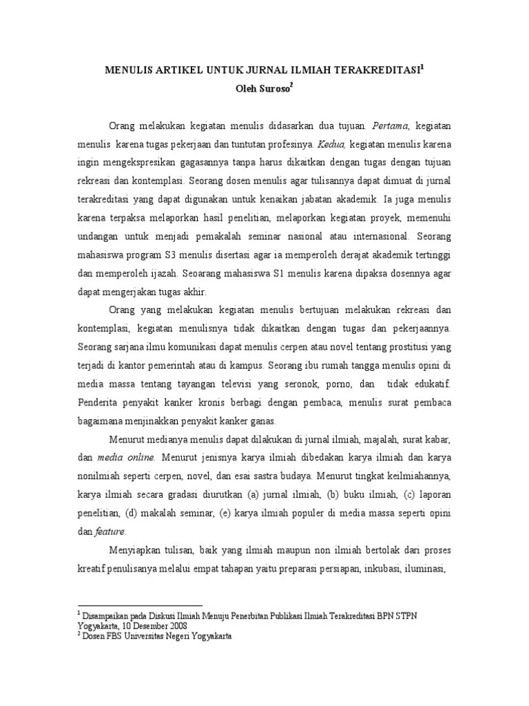 Menulis artikel untuk jurnal ilmiah terakreditasi1 oleh suroso2. Kumpulan jurnal penelitian yang lengkap bisa . Jenis artikel yang ditulis tak sebatas laporan penelitian,. Judul artikel (maksimal 3 baris, singkat dan jelas,. Dalam jurnal ilmiah berfungsi untuk mencerna secara singkat isi jurnal.